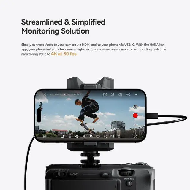 Plug-and-Play, Streamlined Workflow- Connect Vcore to your camera via HDMI and to your phone via USB-C. With the HollyView app, your phone instantly becomes a real-time wireless monitor, supporting 4K 30 fps ultra-low latency transmission with exceptional image quality. With a built-in 5150mAh battery, Vcore can charge your monitoring phone simultaneously. *Note: The HDMI cable must be purchased separately based on your camera model. The HollyView App could be downloaded via Google Play (App Store) for Android (IOS) devices.