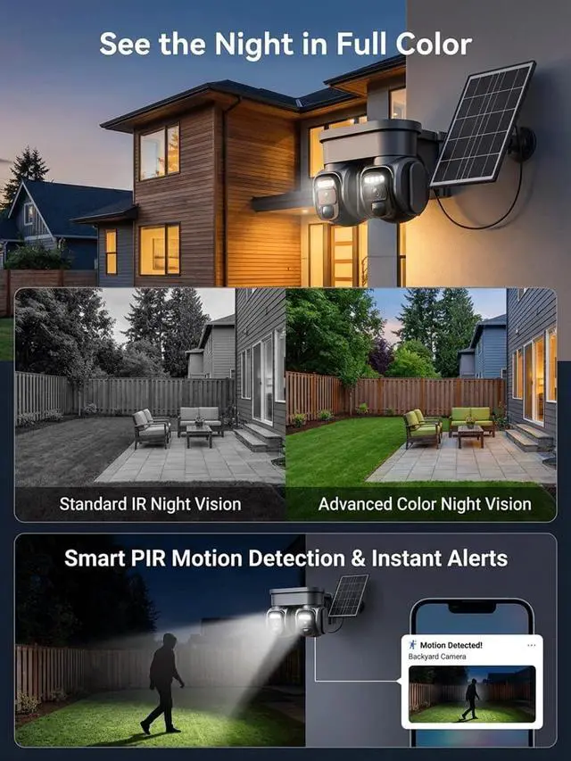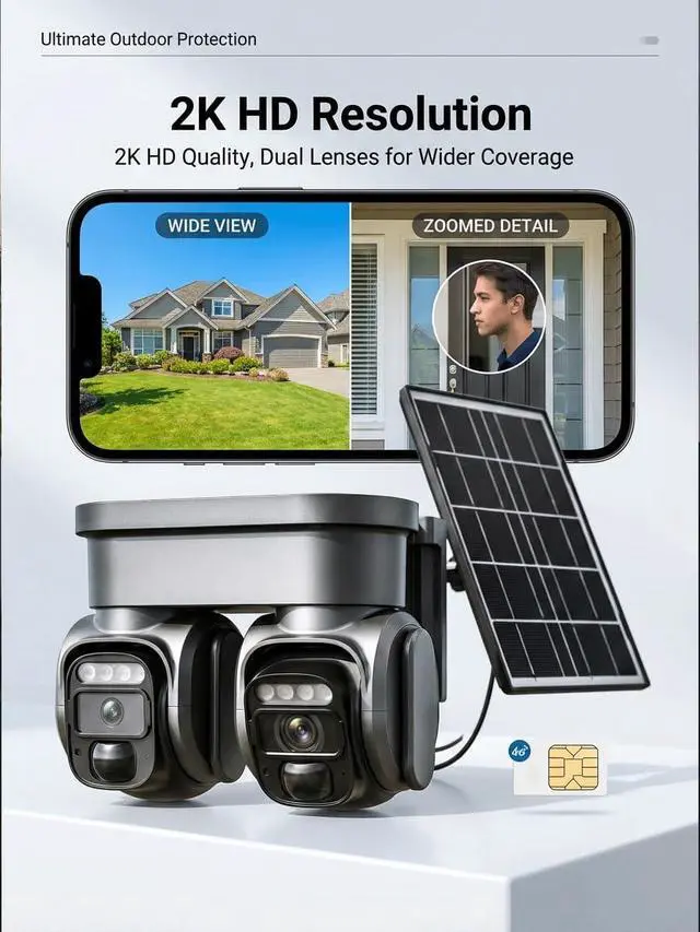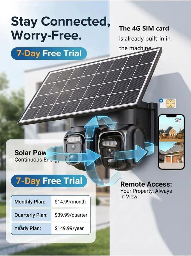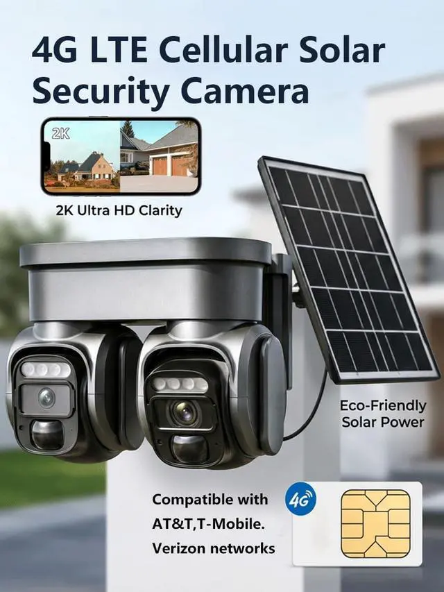 1Solar powered2360° PTZ Security32K Dual-Lens Clarity1Night in Full Color2Motion Detected3Two-way talking14G plan2IP66 Weatherproof3USE WAY Does this camera require WiFi to work?
