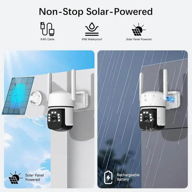 Energy-efficient & Easy to Install: Featuring a built-in rechargeable battery and an external solar panel, it automatically switches power sources based on weather conditions to ensure continuous operation. Installation takes just minutes, eliminating messy wiring and frequent battery changes.