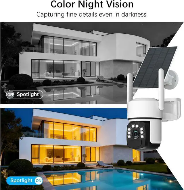2K HD Resolution & Color Night Vision: This security cameras wireless outdoor delivers 2K high-definition resolution, capturing every detail in vivid color even in pitch-black nightsnever missing a moment. Remotely control the camera's horizontal/vertical rotation via the app for 360° seamless monitoring of your home security.