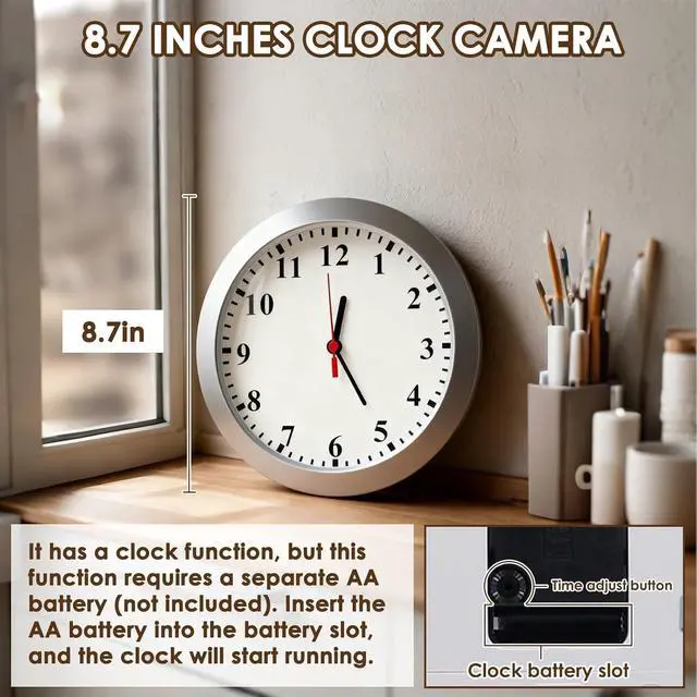 Clock Camera Multi-Scene: This spy cam features a circular clock shape with a diameter of approximately 8.7 inches, ingeniously integrating the dual functions of monitoring and clock (the clock requires an AA battery but does not include one). Supports flexible placement in multiple scenarios, such as wall mounting or desktop mounting, and the camera Angle can be adjusted as needed.