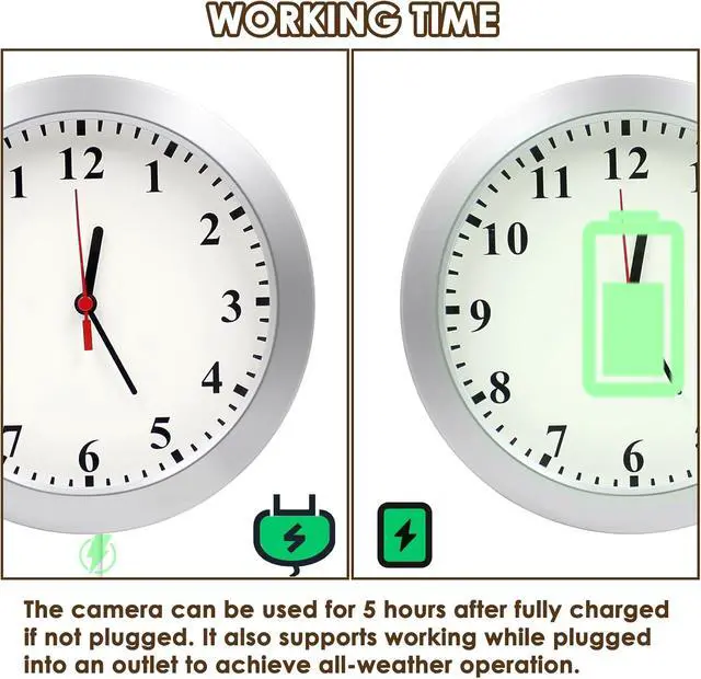 Long working: Our clock camera can be used continuously for 4 to 5 hours when fully charged, and it also supports working when plugged in, plugged in is meets the needs of all-weather monitoring.