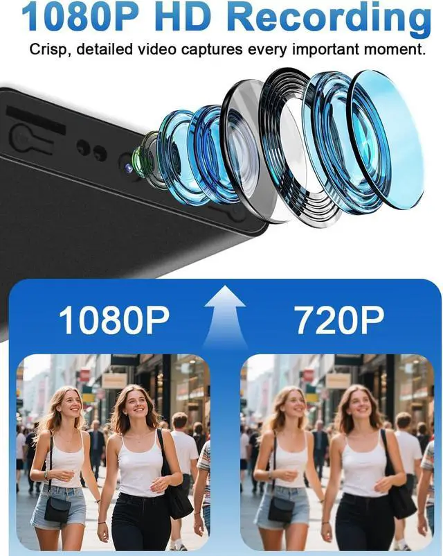 1080P Full HD Quality: Equipped with a 1080P full high-definition lens, captures rich details and sharp visuals, clearly recording key information such as faces or objects. It's ideal for documenting important moments or preserving evidence.