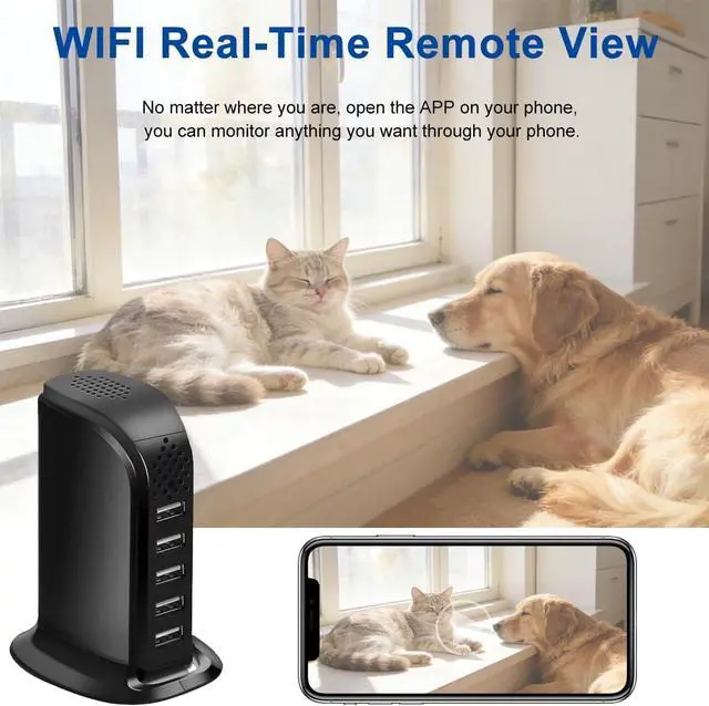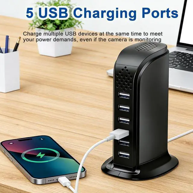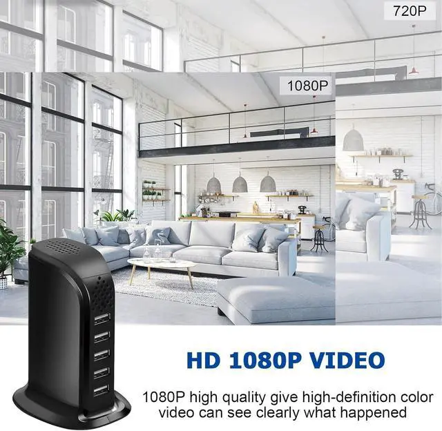 Surveillance video Camera: This discreet indoor 1080P HD camera doubles as a multi-port USB charging station, delivering sharp, clear video of your pets shop office surveillance while powering your devices. This is video only camera.
