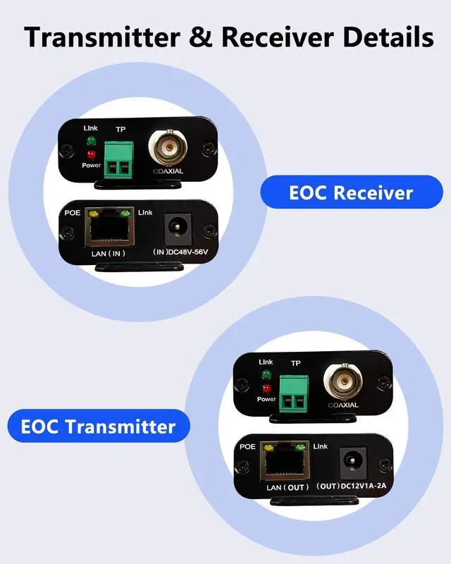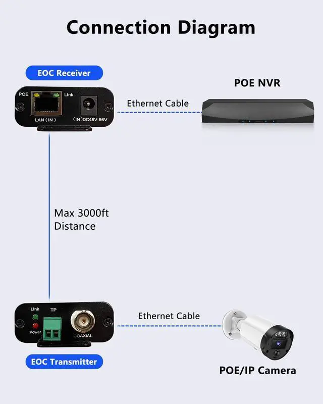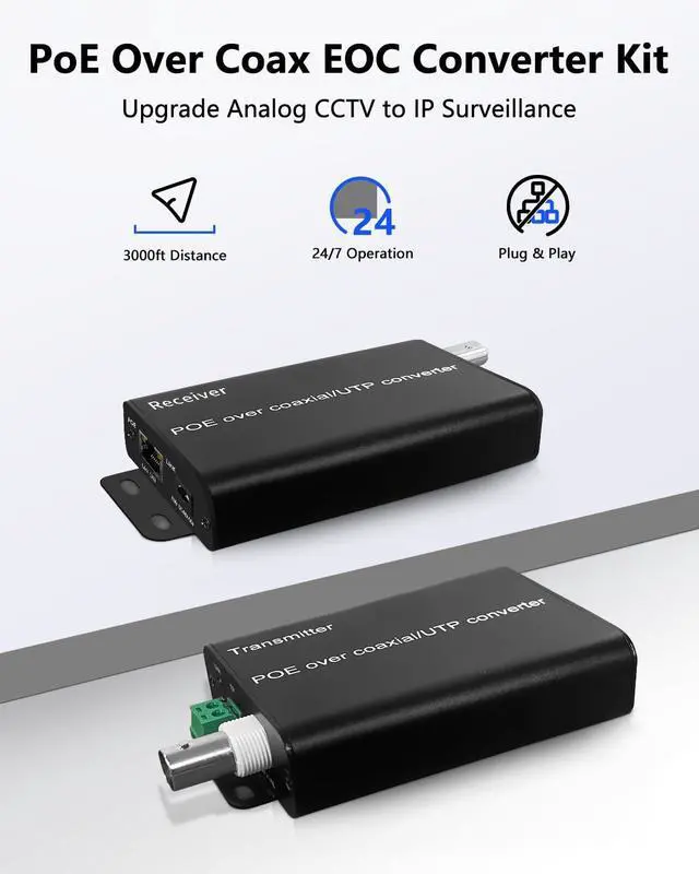 PoE & EOC Converter PoE Over Coax EOC Converter Kit allows you to upgrade CCTV analog cameras to IP surveillance systems using existing coaxial cables. Supports Ethernet Over Coax and PoE transmission up to 3000ft, compatible with IEEE 802.3af/at standards. Perfect for IP cameras, NVR, DVR, and VoIP devices.