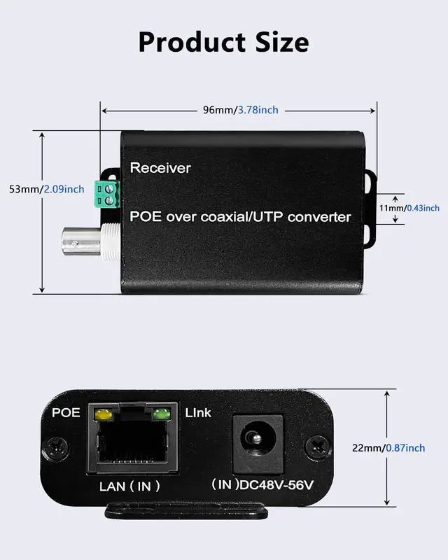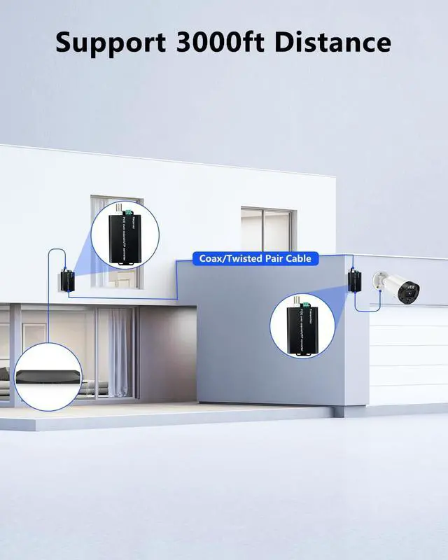 Ethernet & Power Over Coax Achieve 100Mbps bandwidth within 1000ft and 10Mbps up to 3000ft, ensuring smooth video streaming and stable network transmission. Ideal for long-distance Ethernet Over Coax projects in warehouses, office buildings, or elevators.