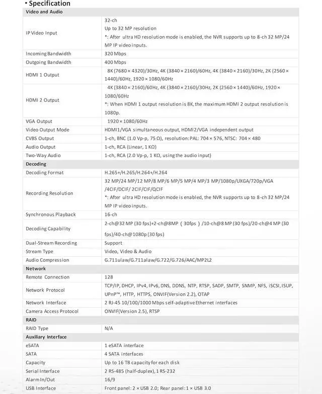 Up to 32-ch IP camera inputs and 320 Mbps incoming bandwidth
