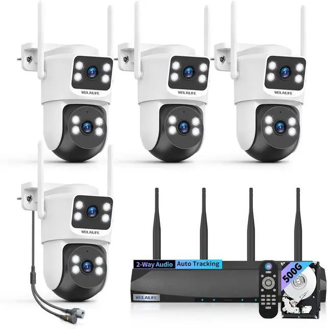 PTZ Control & Color Night VisionWith a 350° horizontal and 90° vertical range, these outdoor home security cameras eliminate blind spots. The wireless PTZ control lets you monitor your entire property from your phone. They support infrared night vision and full-color white light mode providing clear full-color images day and night.