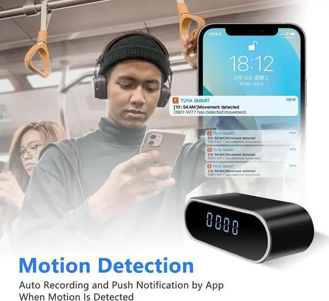 Instant Notification, Keeps Home Safe When you turn on motion detection, the spy camera will automatically start to record video when it detects moving objects within its lens sight. Whats more, the hidden camera will push notification to your phone immediately, so you can know what happened to your home or office, which makes your home or office safer