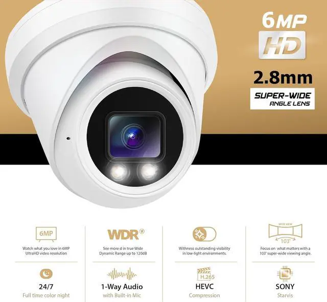 6MP Ultra HD Resolution Capture sharp, detailed video with a 2.8mm wide-angle lens for broader coverage.