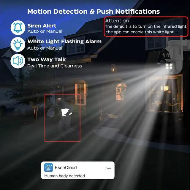 PIR Human Detection & APP RemoteBuilt-in high-sensitivity intelligent PIR human movement detection system, which can effectively distinguish the human body from other objects and reduce false alarms. When movement is detected, an alarm notification will be pushed to the "Eseecloud" APP. You can view all content through the mobile "Eseecloud"APP in real time.