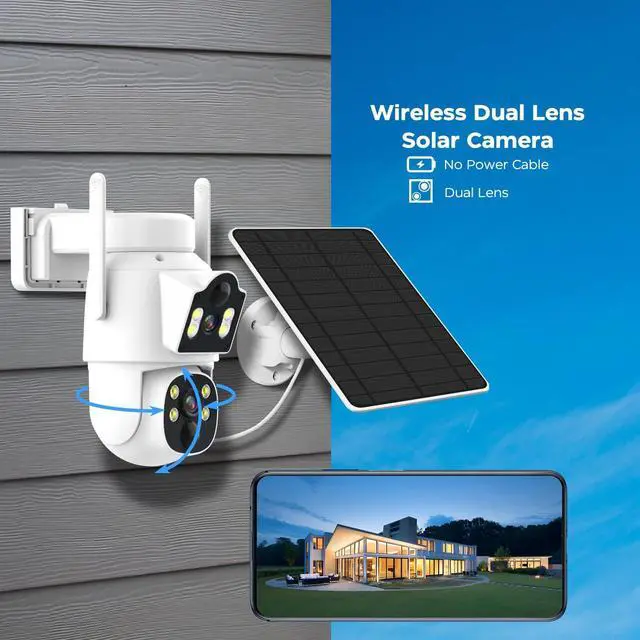 Dual Lens &360° View This solar camera has two lenses1 device = 2 cameras. The 2 lenses cover 360° PTZ, each lens is 2MP UHD resolution, with clearer colors and details. One camera, the function is equivalent to 2. You can view the monitoring scene from two different angles at the same time, allowing you to grasp more monitoring details.