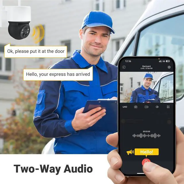 Two-Way AudioBuilt-in microphones and speakers enable real-time two-way audio through the mobile app, allowing you to speak and listen remotely. Whether communicating with family members, visitors, or pets, you can stay connected anytime. As part of a reliable security camera system, this feature enhances everyday use of surveillance & security cameras by adding a more personal and responsive layer of protection.