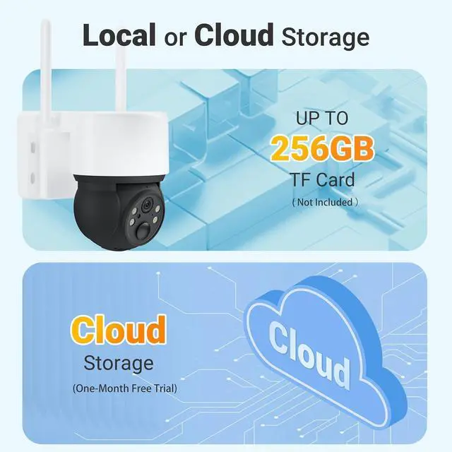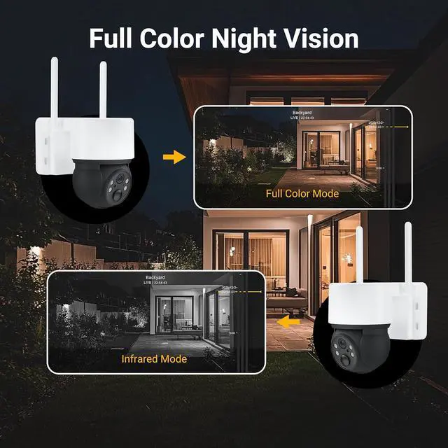 360° Pan & Tilt View for Full CoverageEquipped with a 3MP high-definition video camera, this 360 camera supports 90° vertical and 355° horizontal rotation to deliver near-full panoramic coverage with fewer blind spots. Designed as an outdoor camera wireless solution, it connects to 2.4GHz WiFi and provides reliable coverage for your home, garage, driveway, and backyard. With real-time viewing via the mobile app, you can stay informed of whats happening around your propertyanytime, anywhere.