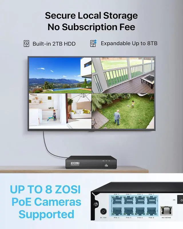 (1). [ Plug and Play Expandable16CH 2TB PoE System] __ Truly plug and play, making it easier for beginners. Just connect the PoE IP camera to NVR with an Ethernet cable for both data & power transmission, more stable and reliable than a wireless system. With an optional PoE switch (not included), this 8 Ports PoE NVR can be expanded up to 16 channels, supporting a maximum of 16 PoE cameras, providing you with the flexibility to add additional ZOSI PoE cameras for your home or growing business.