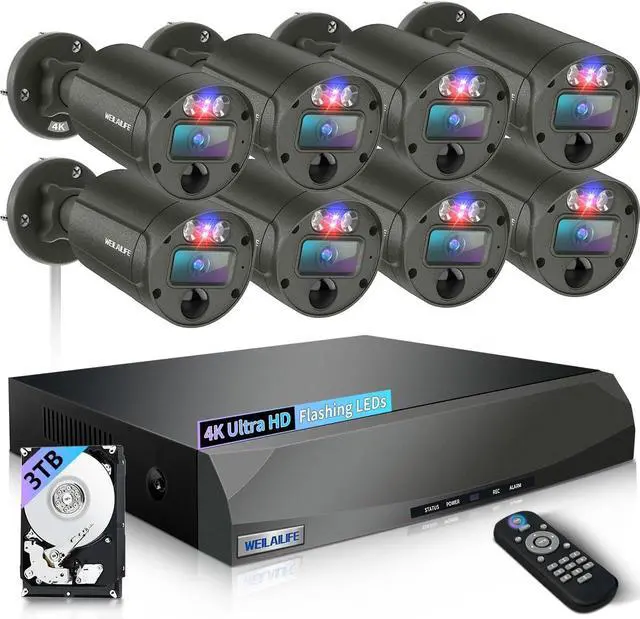 WEILAILIFE 4K Ultra HD Wired Security Camera System + Red & Blue Flashing LEDs POE Security Camera SystemRed & Blue Flashing LEDs 2-Way Audio PIR Motion Detection & Alerts Easy Setup & Stable Connection Easily locate and replay important moments Remote Access H.265 Technology Non-Stop Recording How does this wired security camera system deter intruders?