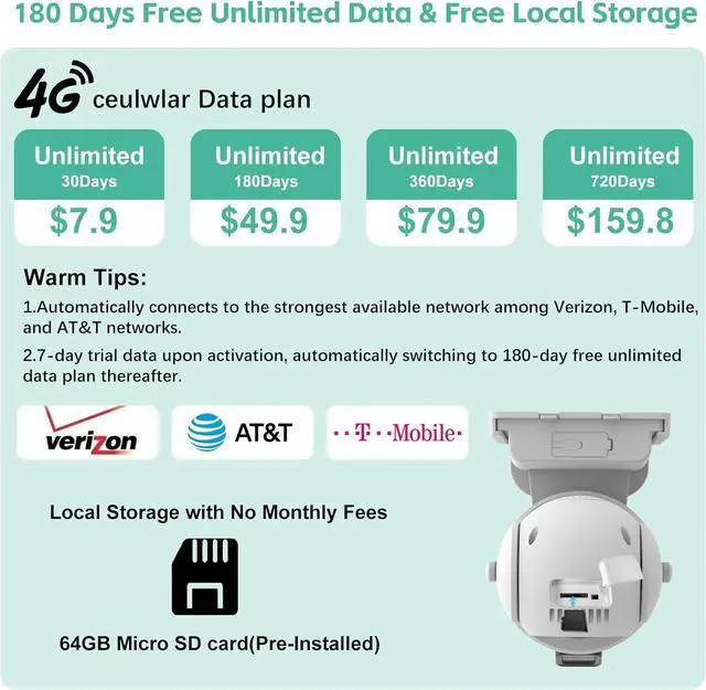 180 Days Free Unlimited Data & Low-Cost RenewalCellular security camera Built-in VSIM card offers 365 days free cellular data ,It activates instantly upon setup and automatically connects to the strongest available network among AT&T, T-Mobile, and Verizon. Plase note:The first 7 days are displayed as test traffic. Once used up,the system will automatically switch to your full 180-day free data plan without any interruption,After your first year, stay connected with our affordable