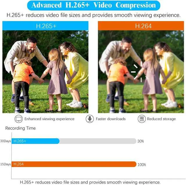 {IP67 Waterproof Weather Resistance} Designed to withstand harsh weather conditions, the durable security camera system boasts IP67-rated waterproofing, allowing for reliable indoor and outdoor use regardless of the weather. With a top-quality ABS housing, this outside camera is built to endure extreme weather conditions from -40°C/-40°F to 60°C/140°F, ensuring their longevity and reliable performance.