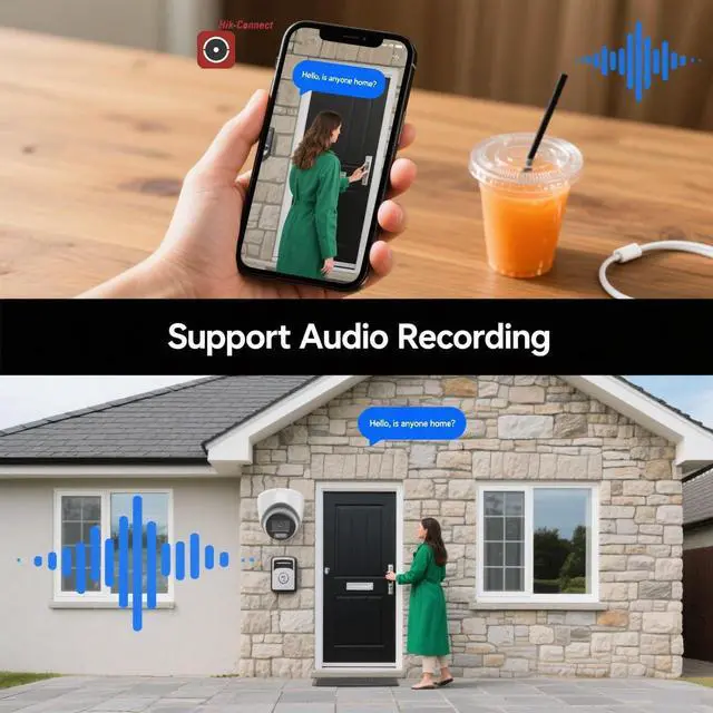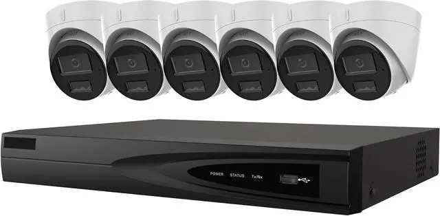 Six 4MP Turret Cameras with Smart Hybrid Light: Equipped with six DS-2CD1343G2-LIUF 4MP IP turret cameras, this system captures crystal-clear, high-definition footage with a 2.8mm fixed lens for wide coverage. The built-in Smart Hybrid Light Technology seamlessly switches between white light and infrared (IR) night vision, ensuring vivid color imaging in low-light conditions and sharp black-and-white footage in complete darkness, keeping every detail visible 24/7.