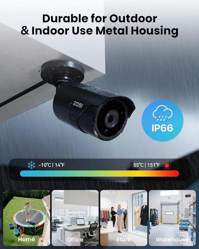 Metal Housing & IP66 Weatherproof: Built with durable aluminum metal housing and IP66 weatherproof rating, these cameras withstand rain, dust, and temperature extremes for reliable indoor and outdoor use year-round.