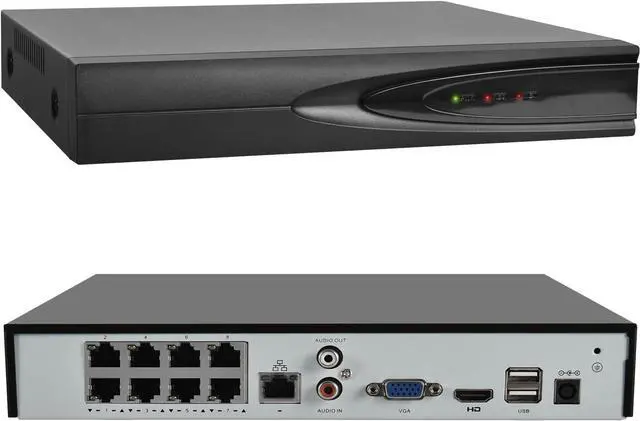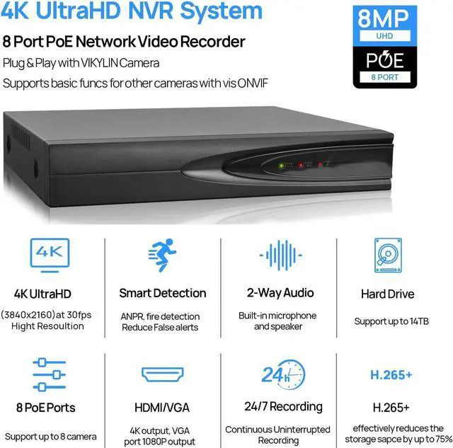 24/7 Video Recording & StorageThe VIKYLIN IP Cameras can record videos with sound 24x7, then transmit HD recordings to PoE network video recorders.This 4K Plug & Play PoE NVR Up to 8Megapixels Resolution Recording and Playback, Support 1-ch HDMI, 1-ch VGA, HMDI up to 4K (3840 x 2160)/30 Hz Resolution, with 1SATA Interfaces, Up to 14 TB capacity for each HDD(HDD Not included), Plug & Play with up to 8 independent RJ-45 10/100 Mbps PoE Ethernet interfaces. 2 USB 2.0 ports for video data backup.