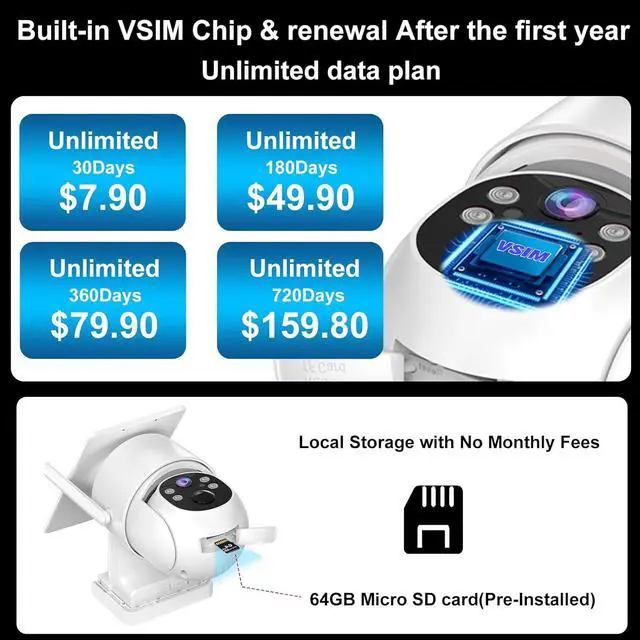 Built-in VSIM & Pre-installed 64GB StorageReady to Use Out of the Box:This 4G cellular security camera arrives fully equipped for immediate setup. With a built-in VSIM compatible with major 4G LTE networksincluding Verizon, TMobile, and AT&Tit automatically connects to the strongest available signal once activated through the app. No need to source or install a SIM separately.For reliable local recording, it also comes with a pre-installed 64GB microSD card (expandable up to 128GB). Combined with advanced H.265 video compression, you can store more high-quality footage while maximizing storage efficiencyall without monthly cloud fees