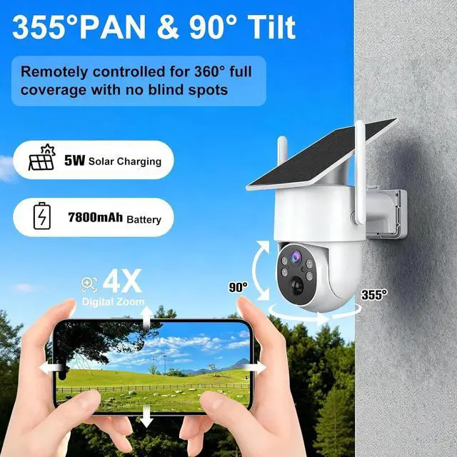 2K Color Night Vision & 360° Full CoverageThis no wifi security camera delivers sharp, detailed 2K video around the clock. Whether its day or night, you can see exactly whats happening with complete clarity. Remotely pan 350° and tilt 90° with 4x digital zoom to cover every angle and eliminate blind spots. Built-in dual spotlights enable full-color night vision up to 49 feet, letting you monitor your property in vivid detailno WiFi needed, from anywhere, anytime