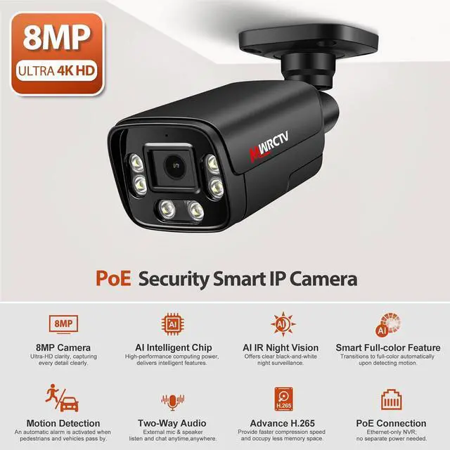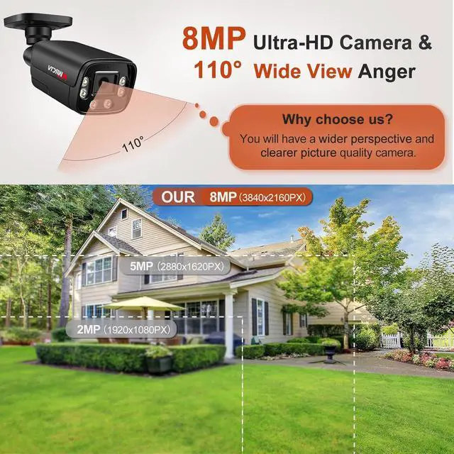 8MP UltraHD with 110°Wide-Angle Coverage+SD Card Slot This Poe security camera has an 8MP HD resolution, delivering exceptionally clear and detailed images. It features a 1/2.8" CMOS sensor, which captures more light compared to traditional 1/3" sensors, ensuring superior performance in low-light conditions and producing brighter, sharper footage. Equipped with a 2.8mm fixed lens, the camera provides a wide 110°viewing angle, offering extensive coverage for enhanced monitoring of large areas.Built in SD card solt,support up to 512G SD card (not included),24/7 recording.Keep your home and Business safty.