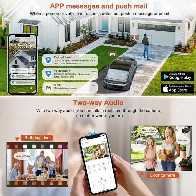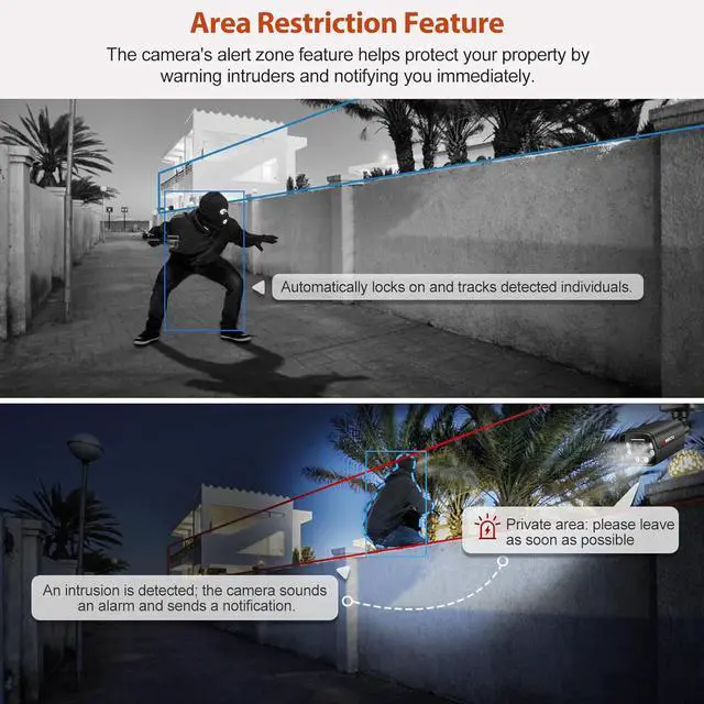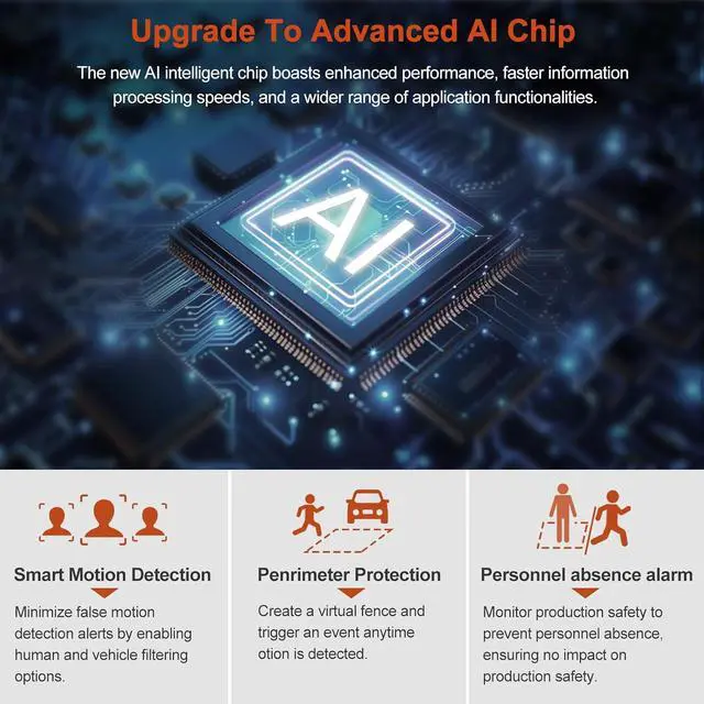 Multiple AI Monitoring FunctionsThis camera is equipped with AI capabilities,you can choose from as needed,including AI Human and Vehicle Detection, which accurately identifies and differentiates between people and vehicles reducing false alarms. The Regional Intrusion Detection feature lets you define specific areas for motion detection.Line Crossing Detection function enables you to set a virtual warning line;once crossed,the camera instantly sends real-time email notifications. Personnel Stay Detection.And more.These intelligent features enhance security and provide precise, customizable monitoring.