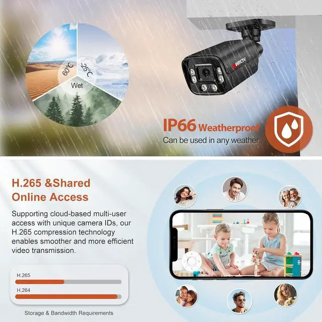 IP66 Waterproof+H.265 CodingThis poe camera is heavy duty full metal case,it designed to withstand challenging environments, the camera features an IP66 waterproof rating, providing robust protection against dust and heavy rain, making it ideal for both indoor and outdoor use. Additionally, it incorporates advanced H.265 video coding technology, which significantly improves compression efficiency compared to traditional H.264. This ensures high-quality video footage while reducing storage space and bandwidth consumption, making it perfect for long-term surveillance and remote monitoring applications.