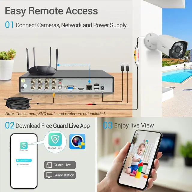 Easy OperationEasy operation interface, VGA/HDMI video output, with 2*USB2.0 interfaces. Support Windows Chrome/Firefox/Edge multi-browser viewing, and support Guard station Client software on Windows or Mac. Hard drive is required for recording and playback. Hard Disk is NOT INCLUDED and sold separately. Supports SATA 500GB to 14TB internal surveillance hard drive, We recommend using surveillance hard drive ONLY to avoid premature hard drive failure