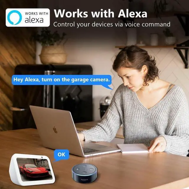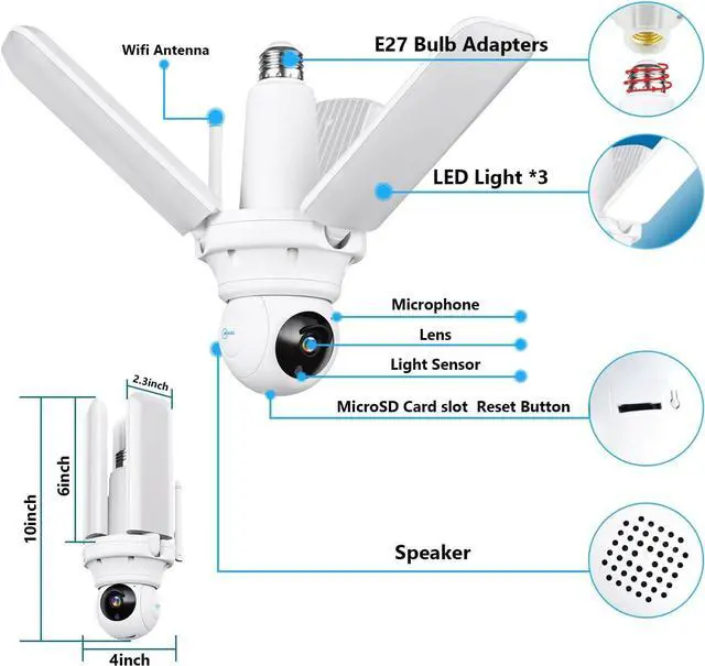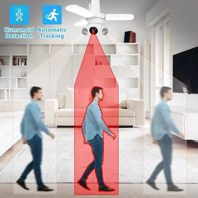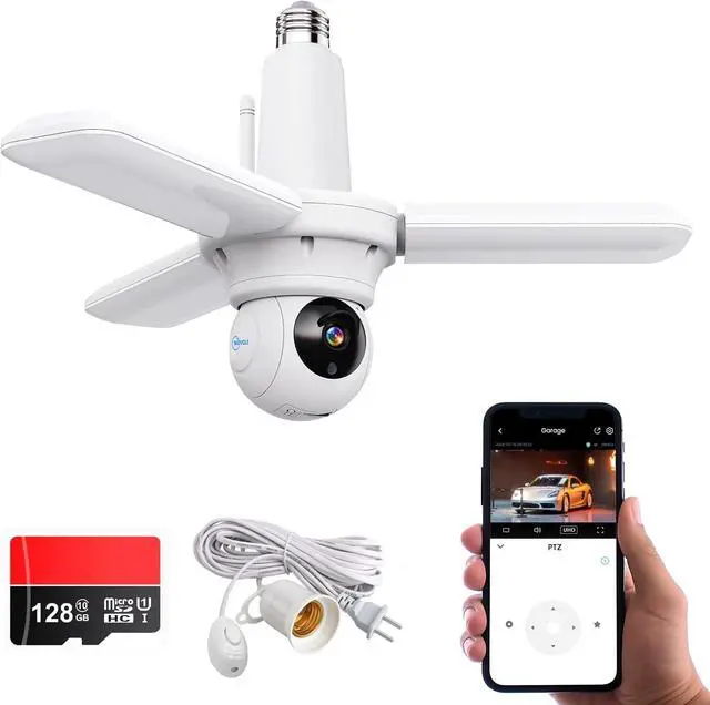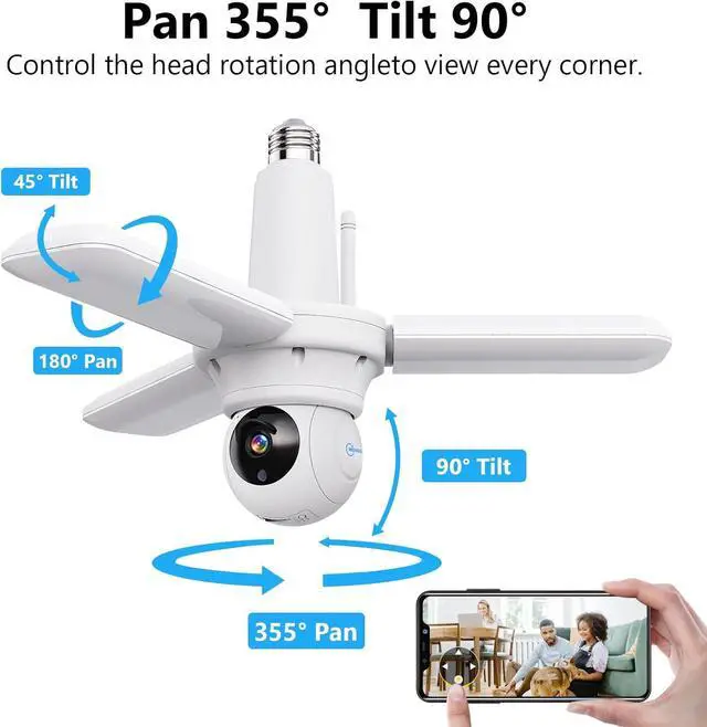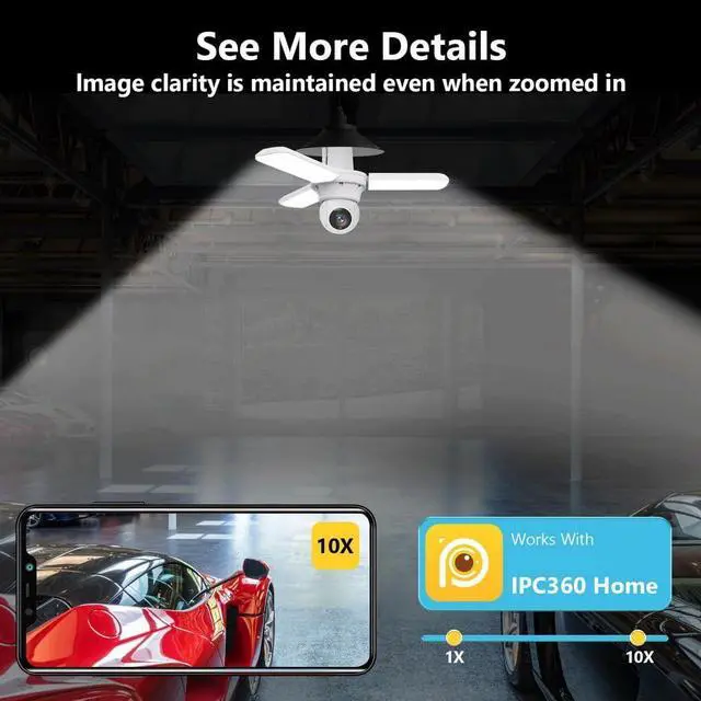 All in one Garage Lights with CameraThe Light Bulb Camera has an Ultra HD resolution that provides clear monitoring footage. Horizontal rotation of 355° and vertical rotation of 90°, covering a wide monitoring area. Intelligent tracking with motion detection, automatically identifying and tracking moving objects. Supports intelligent alarm function, triggering alerts upon detecting abnormal activities.Two-way audio function for remote intercom capabilities.