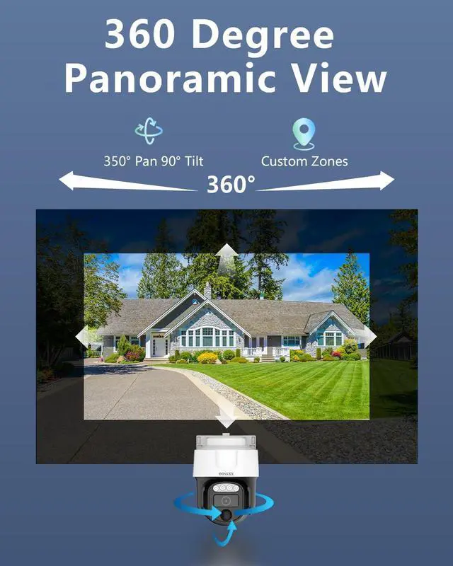 {350°Pan & 90° Tilt Surveillance Camera} This security cameras feature flexible 350° pan and 90° tilt, achieving 360° All- Around Security to eliminate blind spots. Even more conveniently, you can remotely adjust its viewing angle through a DVR or your phone. Great for monitoring large yards, garages, or driveways with minimal blind spots.