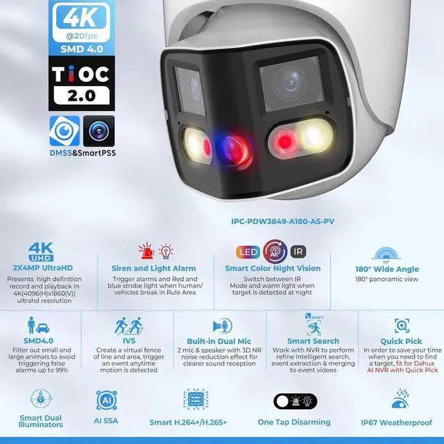 Stop Crime Before It Happens: TIOC 2.0 Defend your premises with our 180° panoramic IP camera, featuring striking red and blue strobe lights and customizable audio alerts that dramatically cut intrusion risks by 98%. Stay connected with real-time alerts from the DMSS app, and directly interact with visitors or deter unwelcome guests using the two-way audio. Equipped with EPTZ, this PoE camera ensures vigilant protection at all times, making it an essential safeguard for any critical situation.