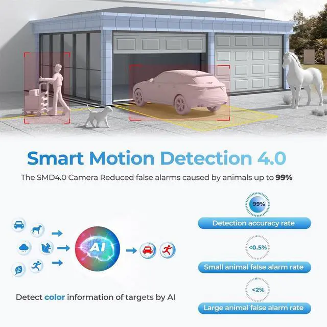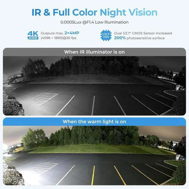 Always Secure, Light Only When Needed Features advanced dual-light technology, automatically switches from IR to warm white light for vivid, full-color video capture of crucial details such as clothing colors and license plates upon human/ vehicle detection, even in low-light conditions. Enhanced with AI SSA (Scene Self-adaptation) technology and AI H.264/H.265 compression, this camera intelligently adapts and optimizes image quality across various scenes, ensuring top-notch surveillance.
