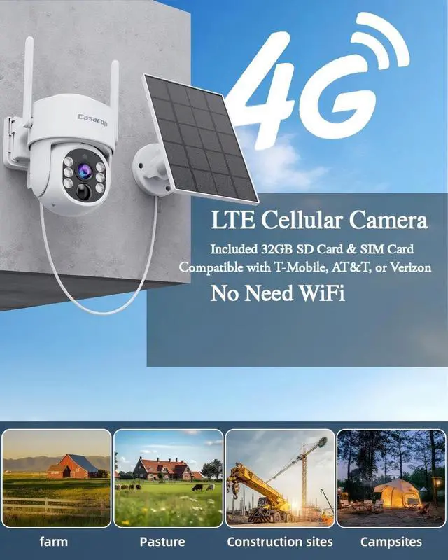 No WiFi, No WireNeed a security cameras wireless outdoor, but have no Wi-Fi or wiring? This solar security camera 4G LTE Cellular is the perfect solution. The surveillance camera works anywhere in the US with cellular coverageno electricity or internet required.Ideal for remote locations like jobsites, barns, farms, ranches, construction sites, vacation homes, and RVs. This wireless camera stays connected even on cloudy days.