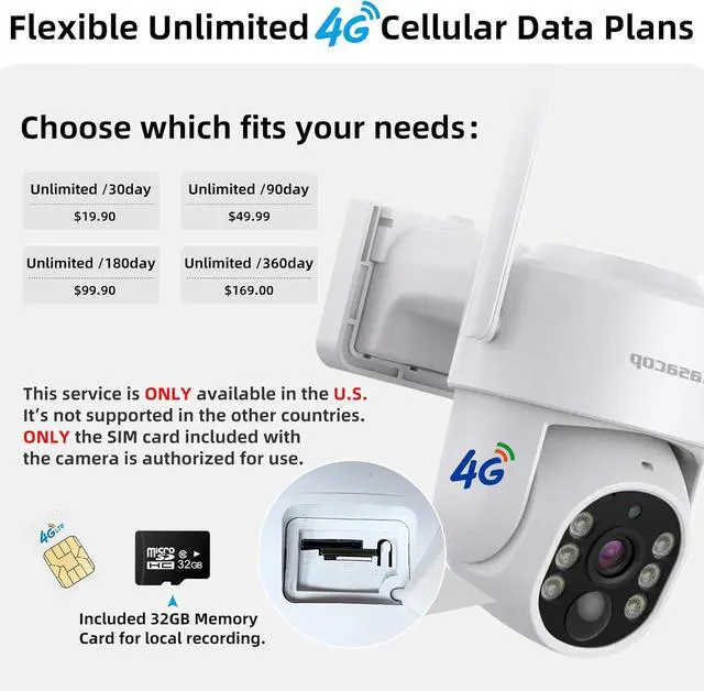Truly Unlimited 4G DataThis outside cameras for home security has a built-in SIM card that auto-connects to the strongest signal from Verizon, T-Mobile, or AT&T for reliable coverage anywhere. Choose your plan: $19.99/month, $49.99/quarter, $99.99/half-year, $169/year. Enjoy a 7-day free trial to test the cameras for home security outdoor risk-free before subscribing. (Only available in the U.S., not supported elsewhere. Only the included SIM card is authorized for use.)