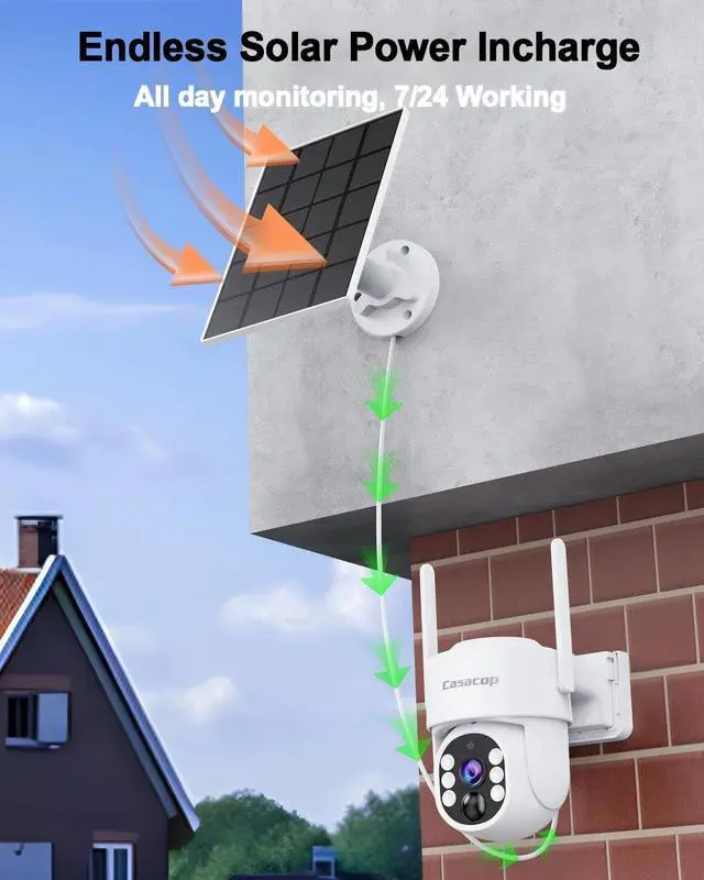 Local 32GB StorageThis solar outdoor camera stores videos on a local 32GB MicroSD card (included), which operates with No Monthly Fee.The surveillance & security cameras' video footage is stored securely on-device, ensuring complete privacy and uninterrupted recording. Access CASACOP App to view the outdoor security cameras' live streams, playback recorded events anytime, anywhere.