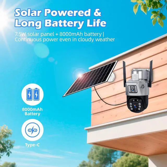Solar Powered & Long-Lasting Battery Built-in 8000mAh rechargeable battery with a 7.5W solar panel ensures continuous power supply. Low-power mode extends standby time even in cloudy weather.