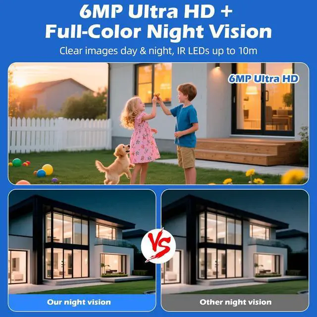 6MP HD & Full-Color Night Vision Delivers 2304*2592 live streaming and recording with 6MP ultra-clear resolution. Full-color night vision and IR LED up to 10m keep images sharp day or night.