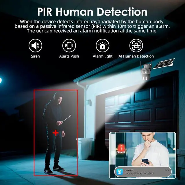 AI Motion Detection & Real-Time Alerts Dual-sensor PIR + radar detects motion up to 10m, reduces false alarms, and sends instant push notifications. Customize detection zones, alarm schedules, and sensitivity.