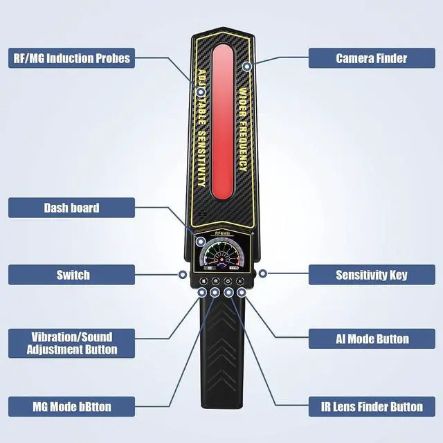 Large LCD Screen & Sensitivity Adjustment The bug and hidden camera detector has a large-size color LCD backlight instrument panel. And different detection values correspond to different colors, which can clearly tell you the strength of the detection signal. The bug and hidden camera detector has a user-friendly sensitivity adjustment button. You can choose the appropriate sensitivity according to different usage scenarios. It is impossible for most bug and hidden camera detector.