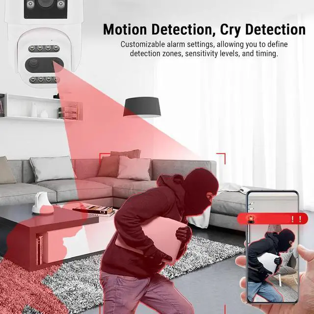 Advanced Detection And Custom Alerts: Supports motion detection, cry detection, and customizable alarm functions. The camera accurately identifies unusual activity and sends immediate alerts. You can also customize detection zones, sensitivity, and time settings for comprehensive security detecting.