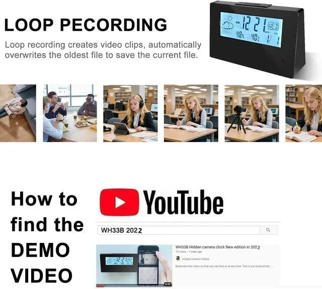 Hidden Camera Clock:This spy camera looks like a regular clock which could tell you time. The lens of spy cam is hidden under the glossy screen thus nobody will notice it. It can be used with wide angle of 140 degree and 4K UHD Lense. Act as a surveillance camera in: Office, Home and Car etc. With LaoZiCao spy camera you will never miss any details clearly thats happening in the room.