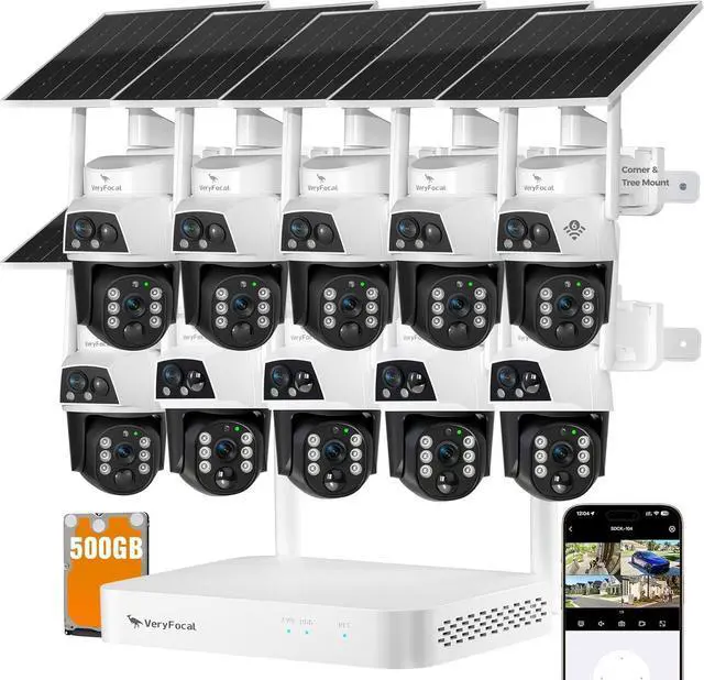 10-Camera Solar Security Kit + 10CH 4K NVRComes with 10×2-in-1 solar cameras, preinstalled 500GB HDD 10CH expandable NVR, all mounting accessories; NVR supports 20 simultaneous live feeds, seamless for home outdoor full-area surveillance