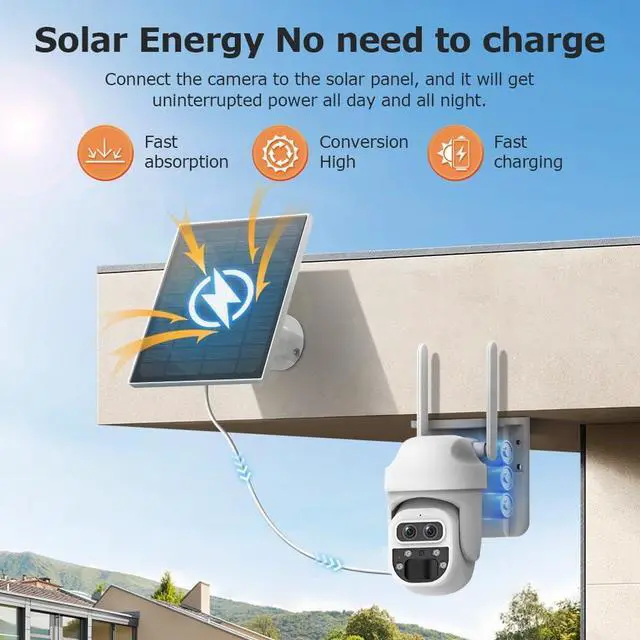 100% wireless solar energy and built-in rechargeable battery. This camera features an efficient solar panel that uses sunlight to fully charge the built-in rechargeable battery, providing 24/7 uninterrupted power even on cloudy days, so you never have to worry about frequent charging. Very suitable for remote areas, farms, or properties without power outlets.