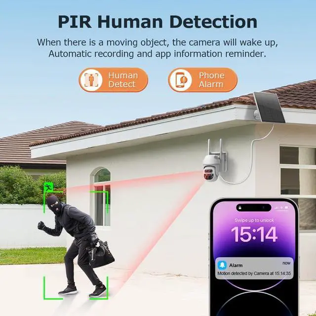 Intelligent PIR human detection and color night vision. Advanced PIR motion sensing accurately filters false alarms and sends real-time and accurate alerts to your phone through the application. When the sun sets, the camera automatically switches to full-color night vision (not just black and white), using infrared LED to capture vivid and detailed shots in the dark. You will see the true colors of every moment at night.