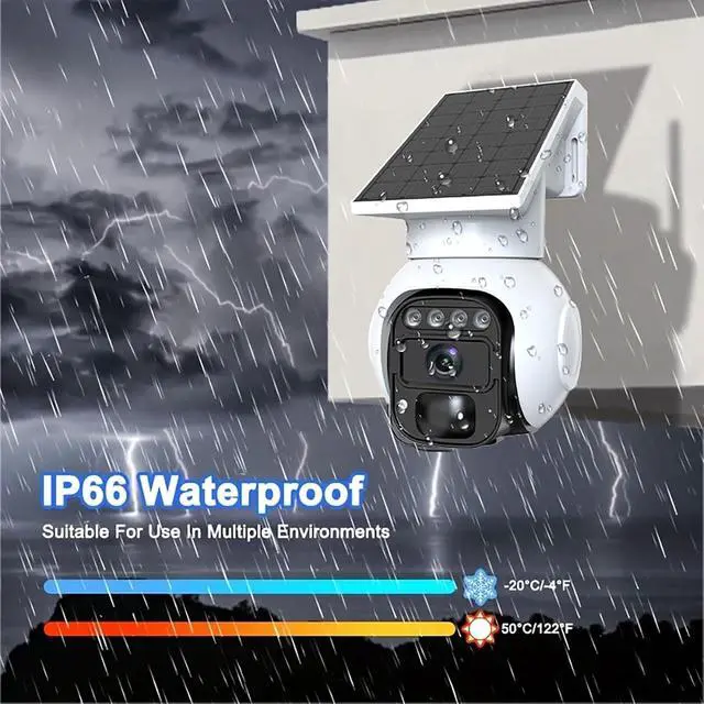 Experience superior outdoor surveillance with this advanced 4G LTE solar-powered security camera. Featuring crystal-clear 8MP QHD resolution and innovative color night vision technology, this camera ensures you never miss important details day or night. The pan-tilt functionality offers comprehensive coverage while two-way audio enables real-time communication. No WiFi required - the 4G LTE connectivity provides reliable monitoring anywhere with cellular coverage. The robust 5200mAh battery coupled with solar charging ensures continuous operation, while IP65 waterproofing makes it weather-resistant for year-round use. Motion detection alerts keep you informed of activity, and the generous 128GB SD card support allows extensive footage storage. The sleek design measuring 10cm x 14cm x 6cm fits discretely in any setting. Compatible with both Android and iOS devices, the user-friendly app puts complete control at your fingertips. Perfect for monitoring farms, construction sites, remote properties, or any location beyond traditional WiFi range. Installation is straightforward, making it an ideal solution for both residential and commercial security needs.