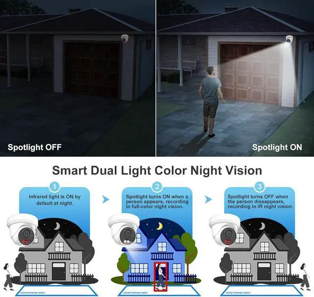 Smart Dual Light Color Night Vision: This 4mp poe ip camera resolution (2560× 1440@25fps). At night, When it detects a human, it Light up the white light for supplementary lighting, and the image switches to color, allowing more color details to be seen. When the person disappears, the camera will automatically switch to infrared black and white night vision. Three modes to switch: Smart, IR, and full color. Note: Ethernet cable and 12V power cord are not included.