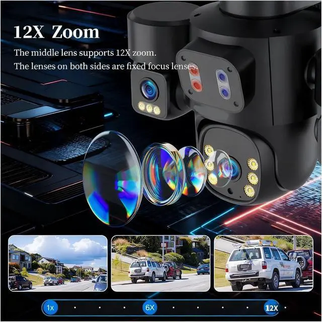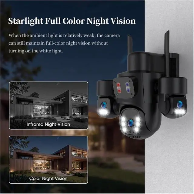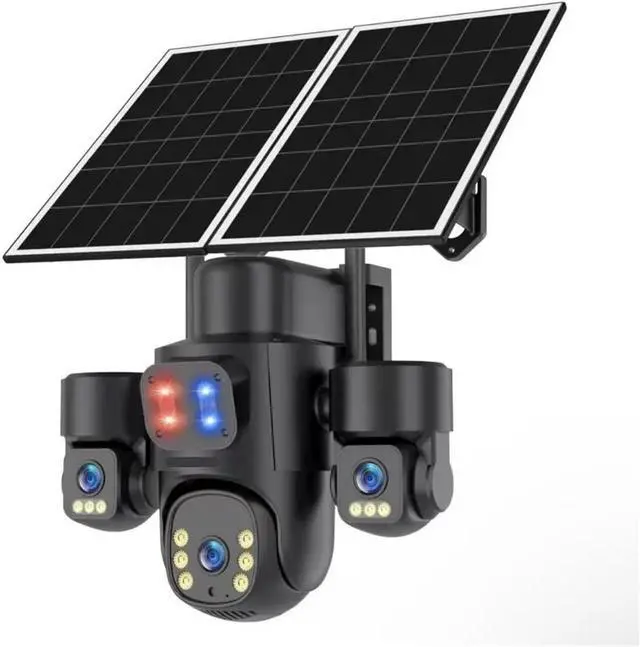 Three-lens 360° panoramic tracking, 30-meter intelligent protection without blind spots: It covers all directions without any monitoring blind areas. It automatically tracks human activities within 30 meters. Red and blue light, sound and light alarms trigger immediately. It accurately captures key scenes day and night. It actively deters and prevents intrusions.